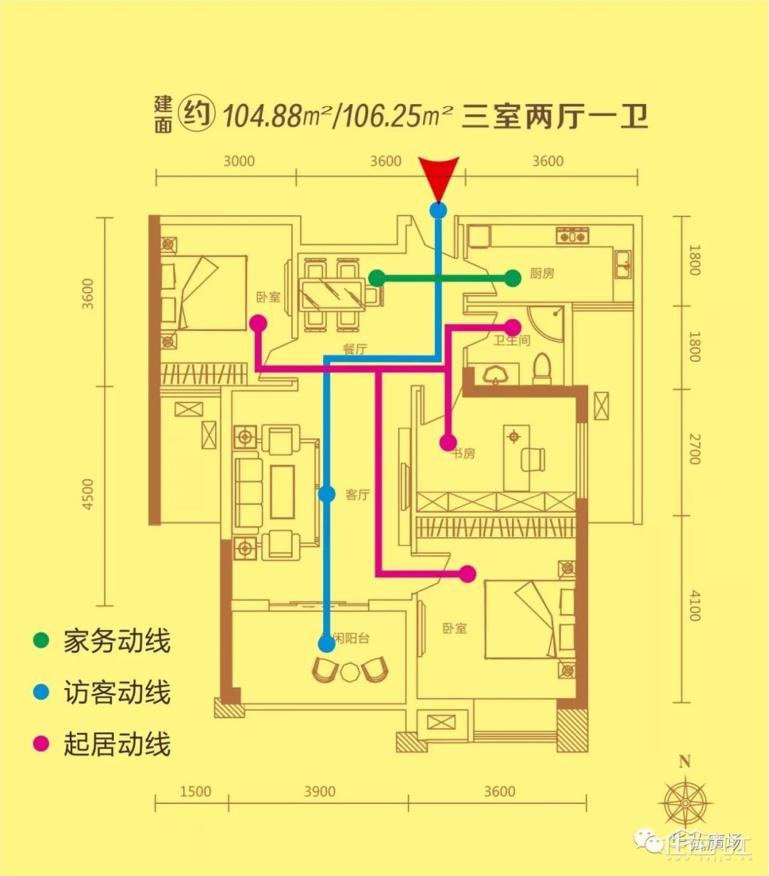 • 建面约104.88㎡/106.25㎡三室两厅一卫