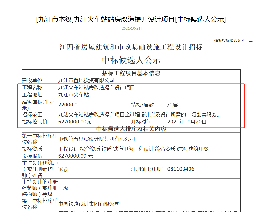 这不,小编近日从九江市公共资源交易平台相关网站获悉,九江火车站站房改造提升项目已经提上日程,目前设计项目招标工作已经完成,中标单位及信息也正在公示中。