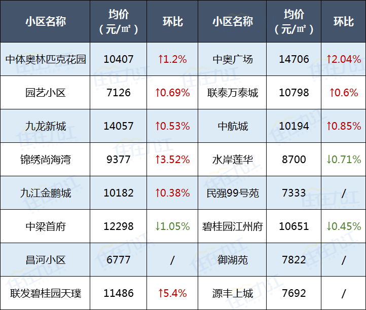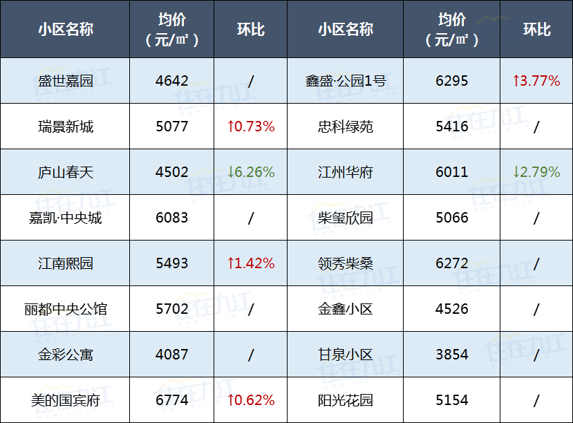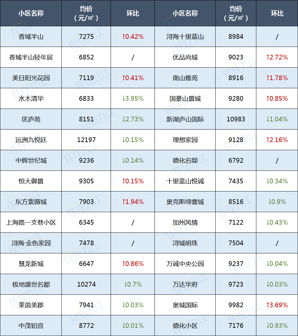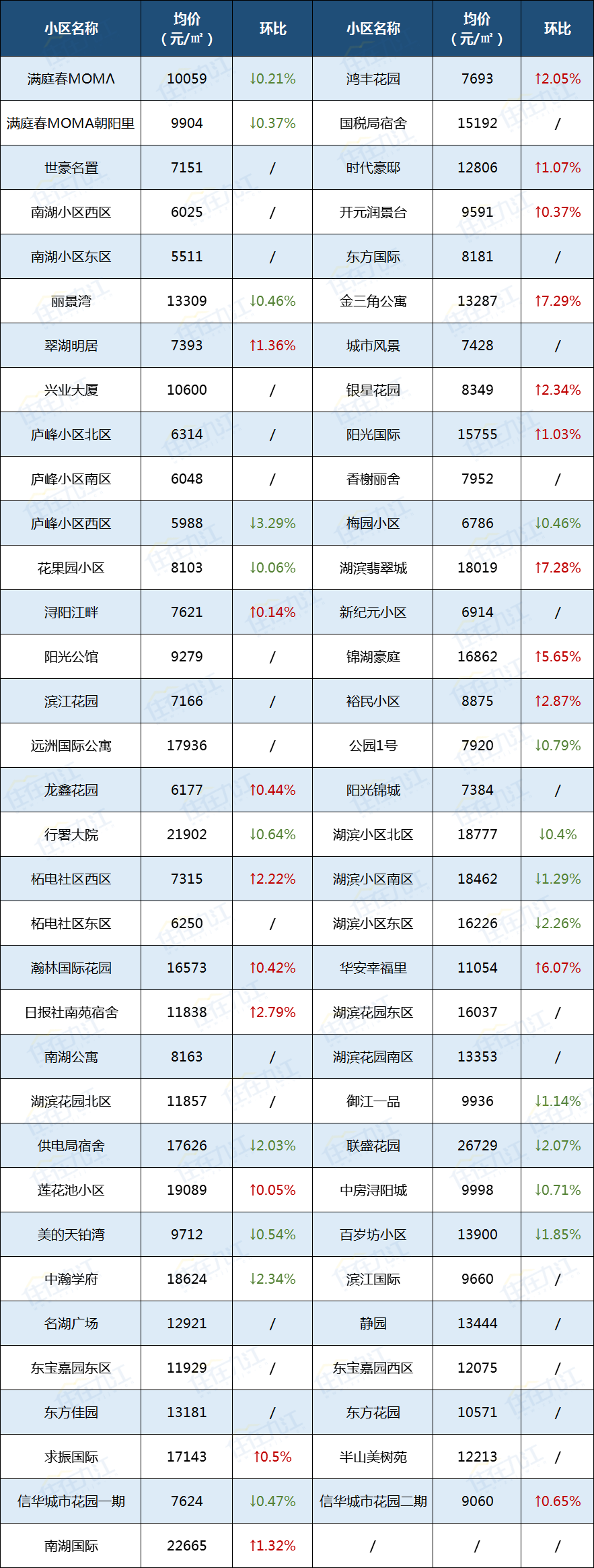 此次共统计了173小区,其中60个小区房价上涨、50个小区房价下跌,63个小区持平!53个小区挂牌价破万!