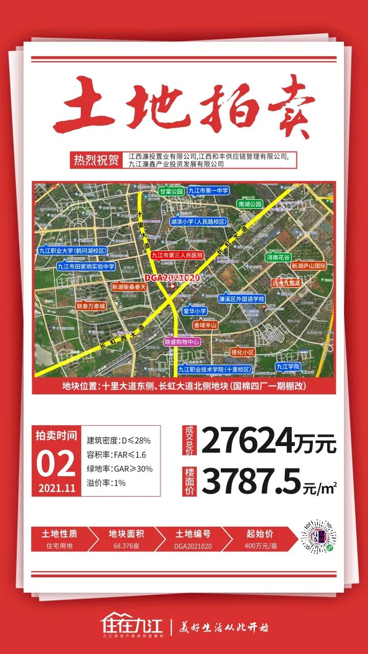 此地块相邻住宅禁止设置“高低配”,需建设养老服务设施(每百户建筑面积不少于20㎡,且不少于150㎡)。该地块位于十里大道东侧、长虹大道北侧地块(国棉四厂一期棚改),起拍总价为27350.4万元(400万元/亩)。成交楼面价3787.5元/㎡,成交总价27624万元,竞得人:江西濂投置业有限公司,江西和丰供应链管理有限公司,九江濂鑫产业投资发展有限公司。