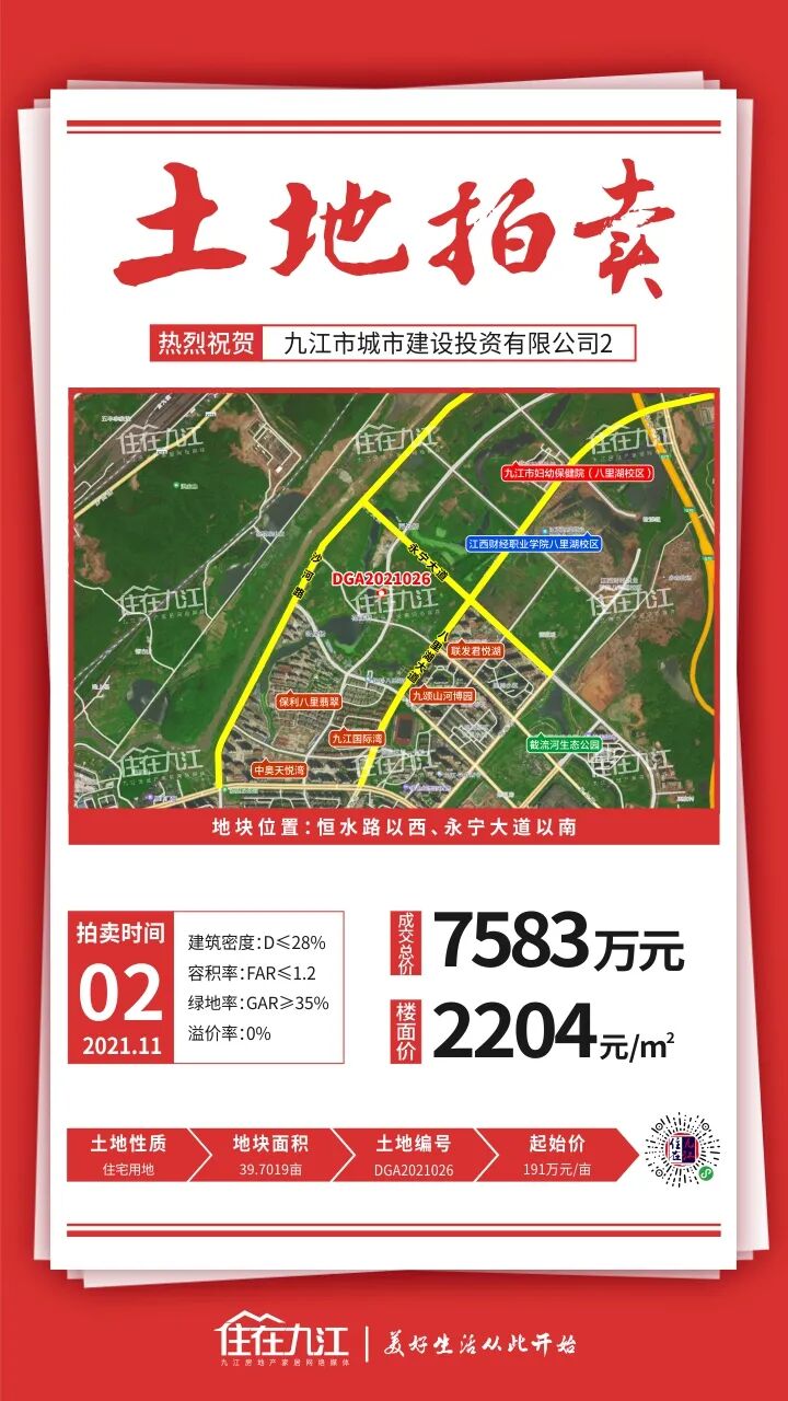需建设养老服务设施(每百户建筑面积不少于20㎡,且不少于150㎡),规划5G楼面站一处,并配建一处建筑面积不小于30㎡的移动通信机房。该地块位于恒水路以西、永宁大道以南,起拍总价为7583万元(191万元/亩)。成交楼面价2387.5元/㎡,成交总价7583万元,竞得人:九江市城市建设投资有限公司。