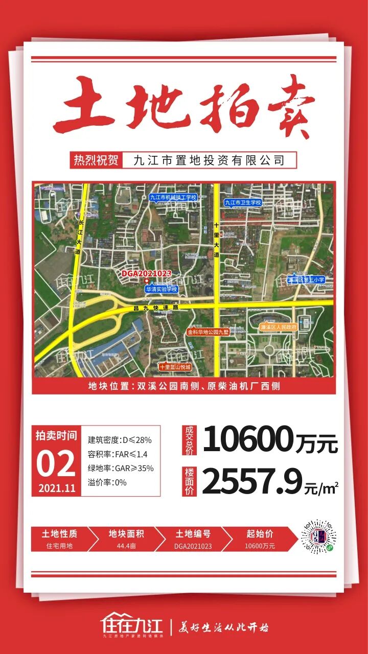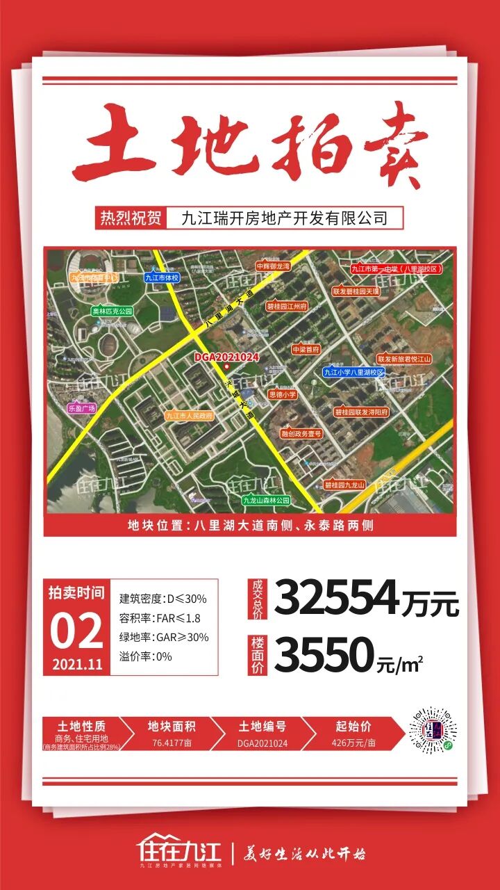 此地块需建设:9个班的幼儿园(用地面积不小于7.5亩,建筑面积不小于3300㎡)、养老服务设施(每百户建筑面积不少于20㎡,且不少于150㎡),规划5G楼面站一处,并配建一处建筑面积不小于30㎡的移动通信机房。该地块位于八里湖大道南侧、永泰路两侧 ,起拍总价为32553.94万元(426万元/亩)。成交楼面价3550元/㎡,成交总价32554万元,竞得人:九江瑞开房地产开发有限公司。据悉,瑞开在今年的8月和10月分别在浔阳区(中辉瑞开·甘棠书苑)、开发区拿下优质地块,这次又在八里湖拿下新地块,看来,又是一个准备深耕九江的房企。