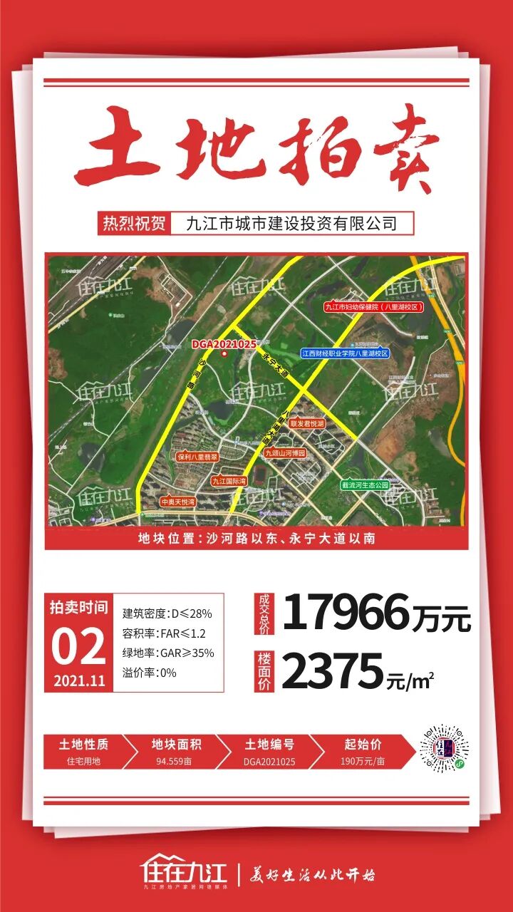 土地用途:商务、住宅用地(商务建筑面积所占比例28%)此地块要求商务建筑高度不低于100米(含造型构架高度),住宅建筑高度不低于35米,不高于67米。另需建设养老服务设施(每百户建筑面积不少于20㎡,且不少于150㎡)该地块位于沙河路以东、永宁大道以南,起拍总价为17966.21万元(190万元/亩)。成交楼面价2375元/㎡,成交总价17966.21万元,竞得人:九江市城市建设投资有限公司。