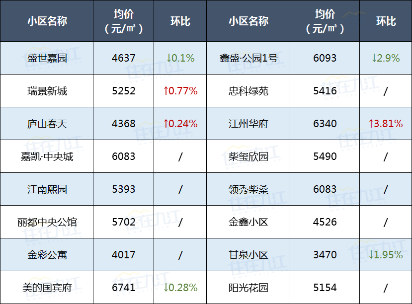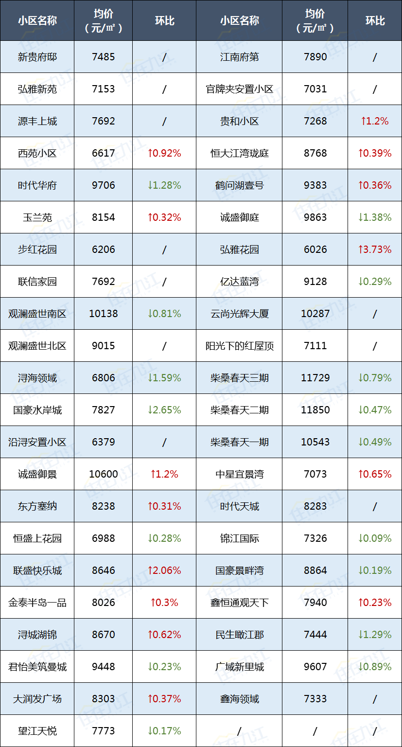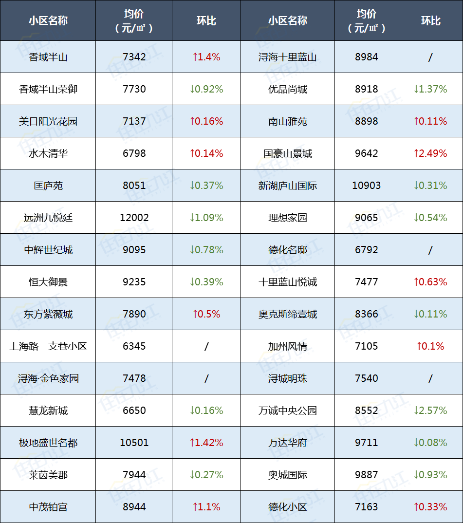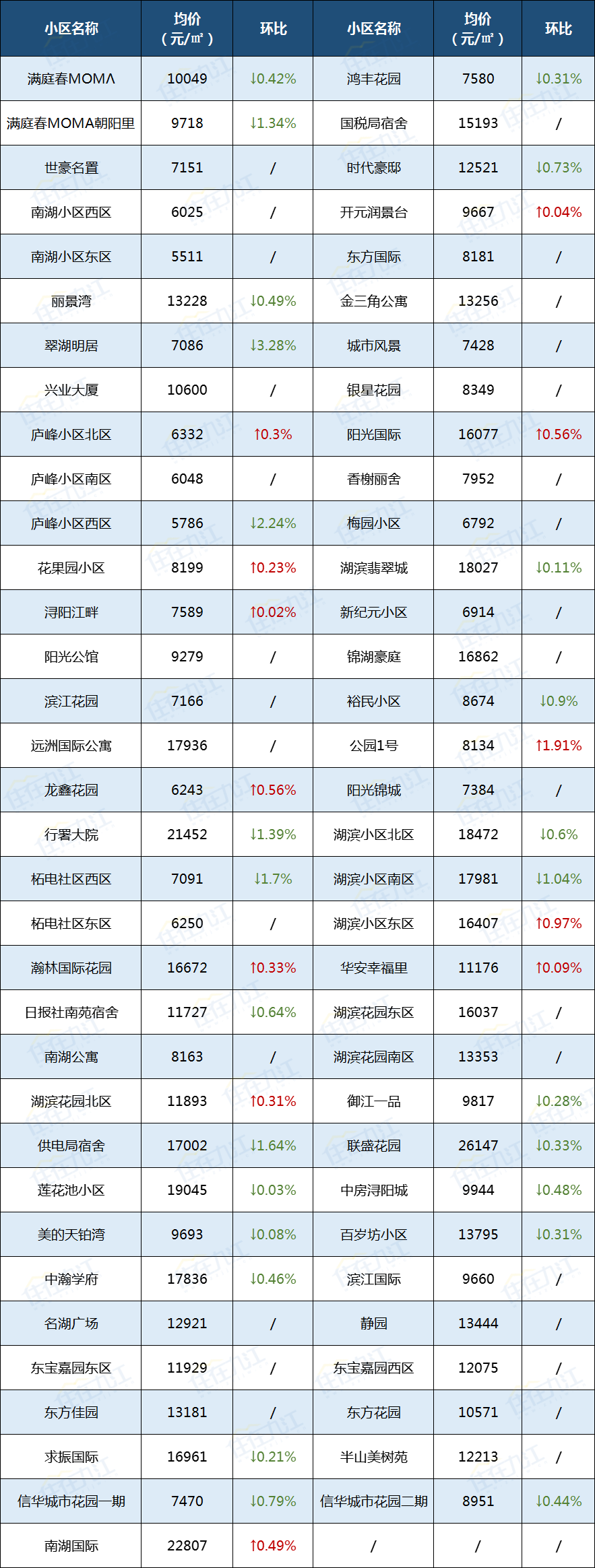 此次共统计了172小区,其中44个小区房价上涨、67个小区房价下跌,61个小区持平!52个小区挂牌价破万!