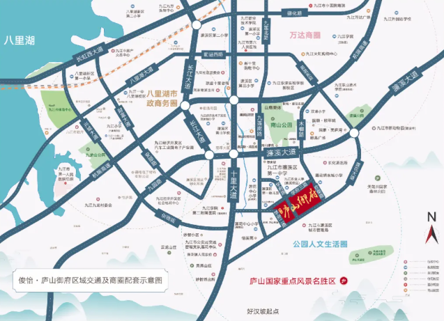 俊怡·庐山御府,位于庐山脚下、十里功能片区,周边是莲花大道,濂溪大道,离濂溪区一中比较近,项目内还规划了项目配套的特色商业街区。