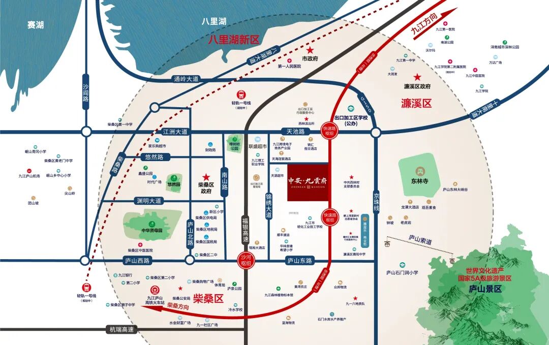 公办的9年制的出口加工区学校以及柴桑一小、小神童幼儿园、启明星幼儿园、九江理工学院等教育配套环伺项目周边。