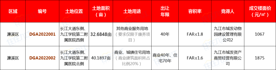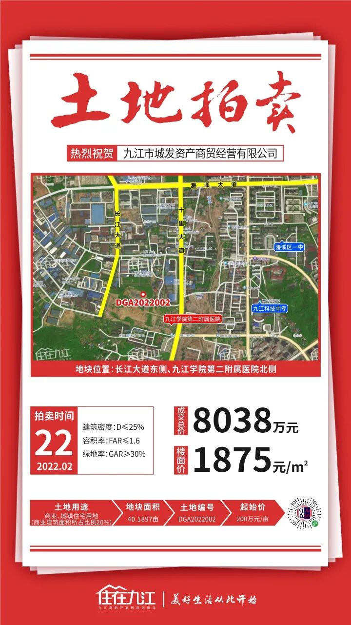 DGA2022002地块被九江市城发资产商贸经营有限公司以底价竞得,溢价率0%。