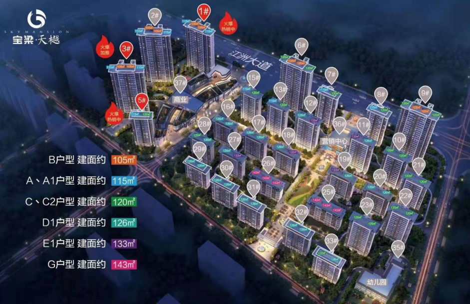 共设计3栋25层住宅,2栋26层住宅,2栋17层住宅,9栋16层住宅,9栋11层住宅,3栋9层住宅,2栋6层住宅,集中设置了一条商业街区及一栋商业会所建筑,并在东南角配置了 9 班幼儿园。