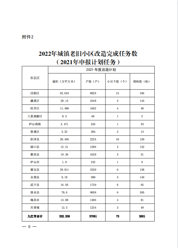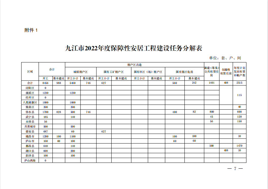 九江市2022棚户区改造开工任务总计6647套,其中城市棚户区改造5460套。