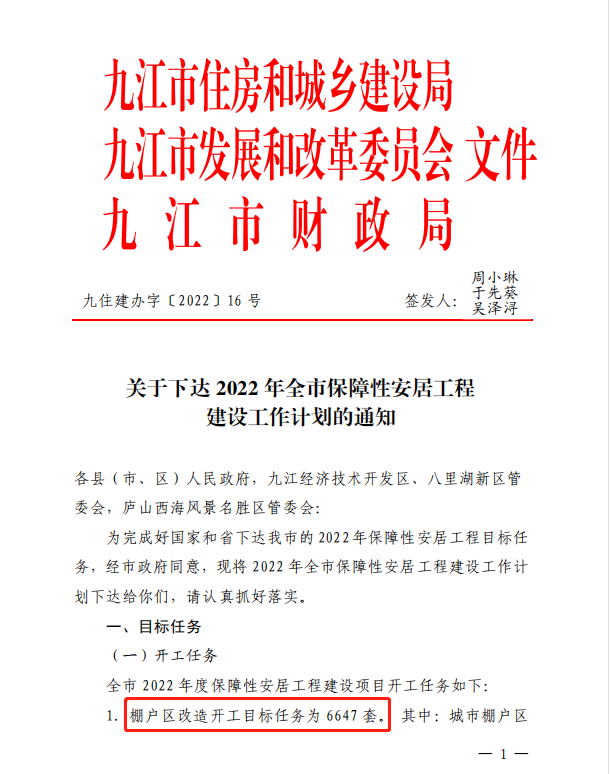 近日,九江市住房和城乡建设局、九江市发改委、九江市财政局三部门联合发布了《关于2022年全市保障性安居工程建设工作计划的通知》。