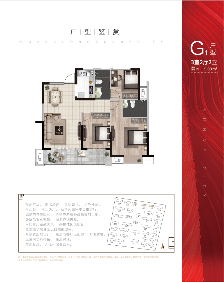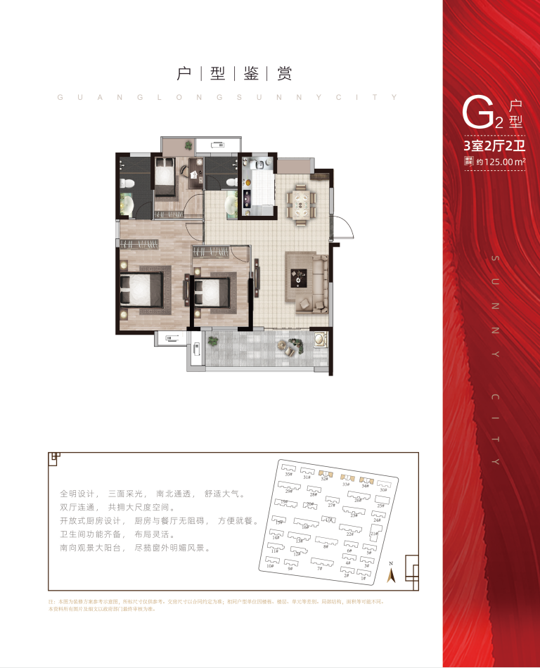 目前项目在售30#(18层)、33#(33层)、34#(26层)楼,所剩房源不多。现荣耀加推32#(33层)楼,建面约93-125㎡三房现房,折后均价约4600元/㎡。