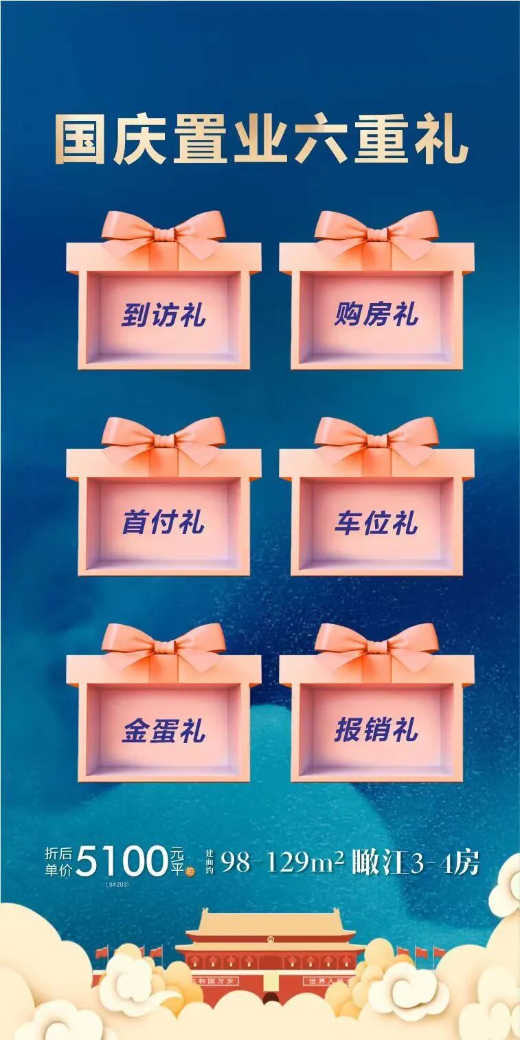 浔阳·滨江天悦重磅推出“国庆置业六重礼”,助力5字头入住浔阳江景房。好房、好价、好礼、好惠等福利来袭,抢房安家快人一步!