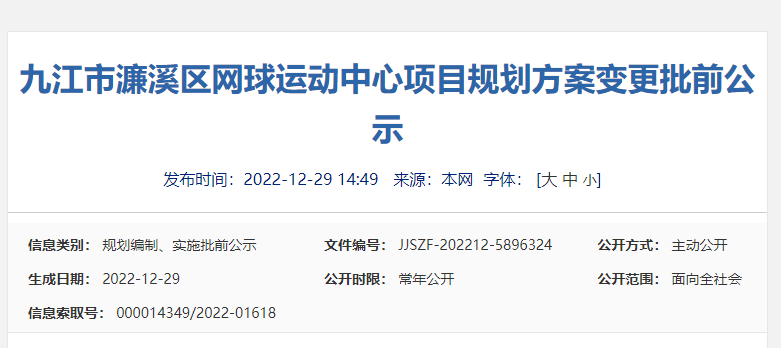 近日,九江市自然资源局公布了九江市濂溪区网球运动中心项目规划方案变更批前公示,九江濂溪区又将新增一处运动场馆,一起来看看吧。