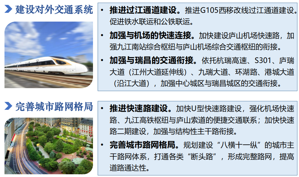 推进九江南站(现庐山站)高铁综合客运枢纽和庐山机场综合客运枢纽建设;完善县乡辅助客运场站建设。
