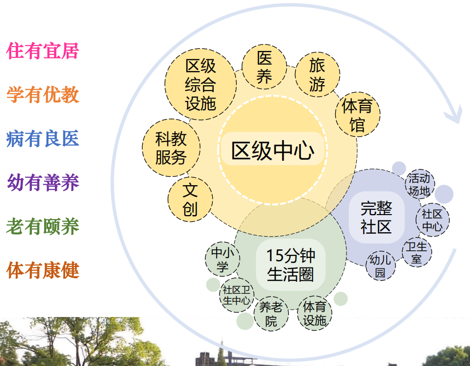 构建区级中心、片区中心、组团中心三级中心体系。形成布局合理、层次分明的公共服务中心体系,塑造全龄友好的高品质城区。打造15分钟、5-10分钟两个层级社区生活圈,构建宜居社区。