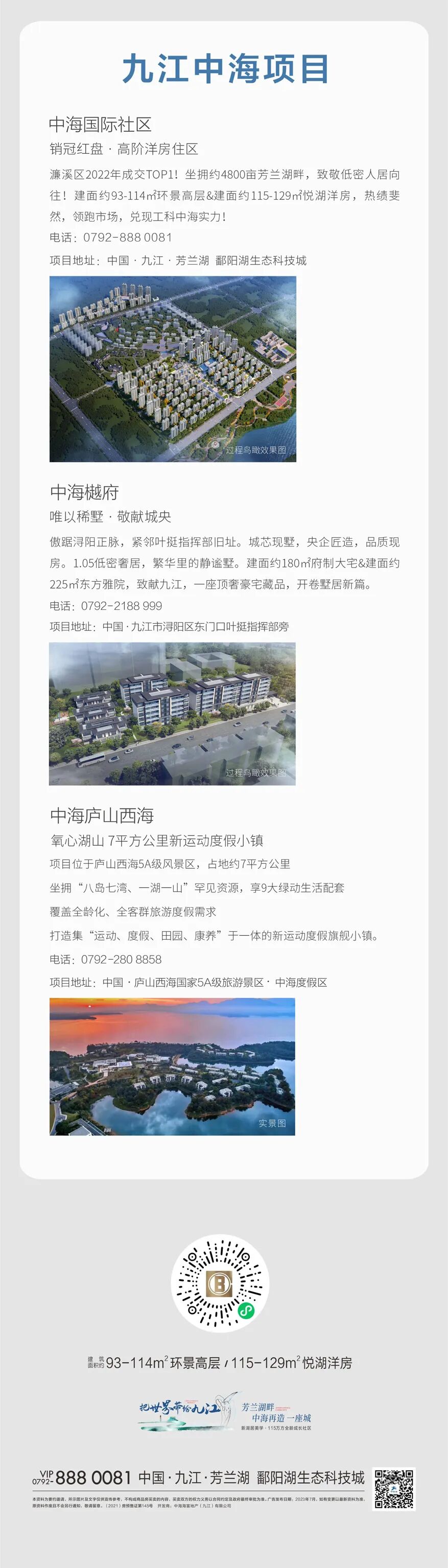 1、“中海九樾”为项目推广名,备案名为“玖樾花园”;开发企业为:“中海宏洋地产(九江)有限公司”;商品房预售证:(2021)房预售证第173号。“中海樾府”为项目推广名,备案名为“海樾花园”;开发企业为:“中海宏洋地产(九江)有限公司”,商品房预售证:(2021)房预售证第54号。“中海国际社区”为项目推广名,备案名为“万锦花园”;开发商企业为:“中海海富地产(九江)有限公司”;商品房预售证号:(2021)房预售证第145号。“中海庐山西海”为项目推广名,备案名为“中海庐山西海桃花里””;开发商企业为:中海宏洋庐山西海(九江)投资有限公司。2、本公众号有关开发项目的信息,最终均以政府审批文件及商品房买卖合同为准。未经本公众号许可,任何人不得擅自使用其中内容信息,否则本公司将依法追究法律责任。3、本公司将对公众号内的内容随时进行更改,更改前将不会另行通知。4、本资料发布时间为2023年7月,本公司保留对宣传资料修改的权利,如有变更以最新资料为准,原资料作废,敬请留意。