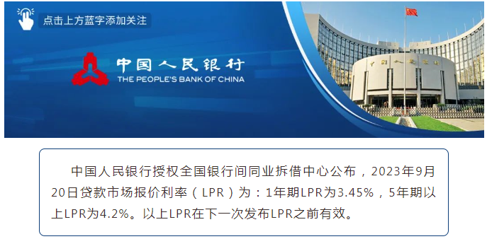 中国人民银行授权全国银行间同业拆借中心公布,2023年9月20日贷款市场报价利率(LPR)为:1年期LPR为3.45%,5年期以上LPR为4.2%。维持不变。