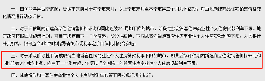 “如果后续评估期内新建商品住宅销售价格环比和同比连续3个月均上涨,应自下一个季度起,恢复执行全国统一的首套住房商业性个人住房贷款利率下限。”