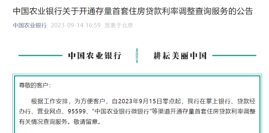 中国农业银行关于开通存量首套住房贷款利率调整查询服务的公告: