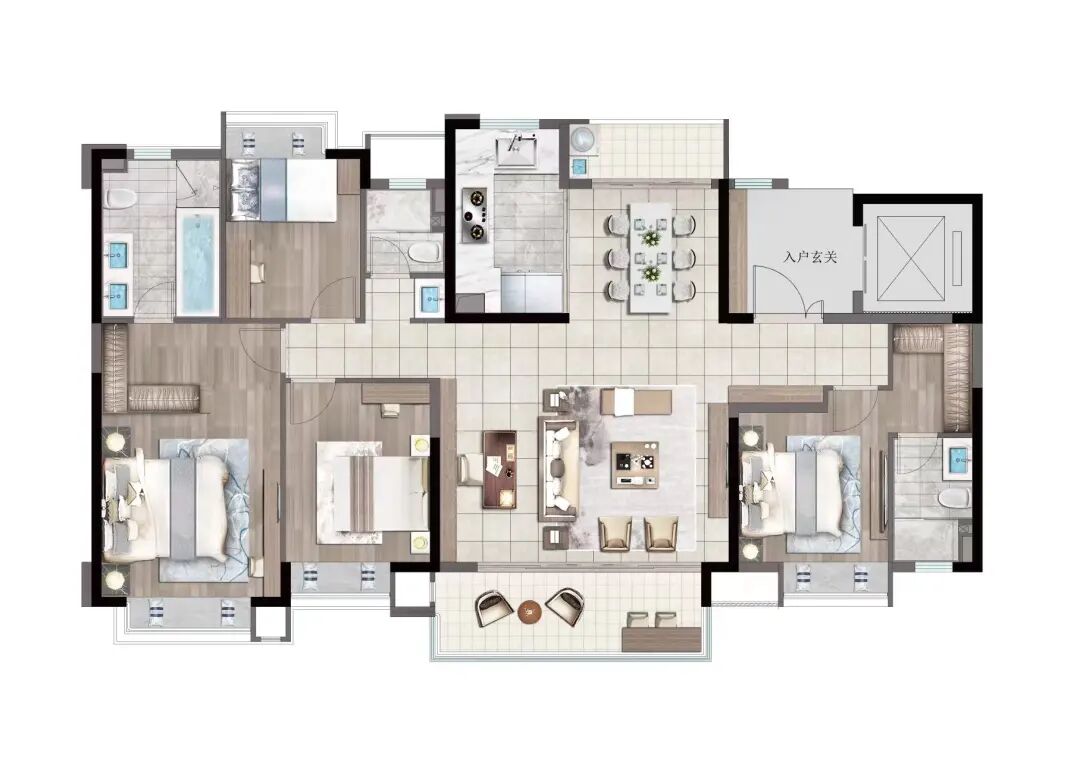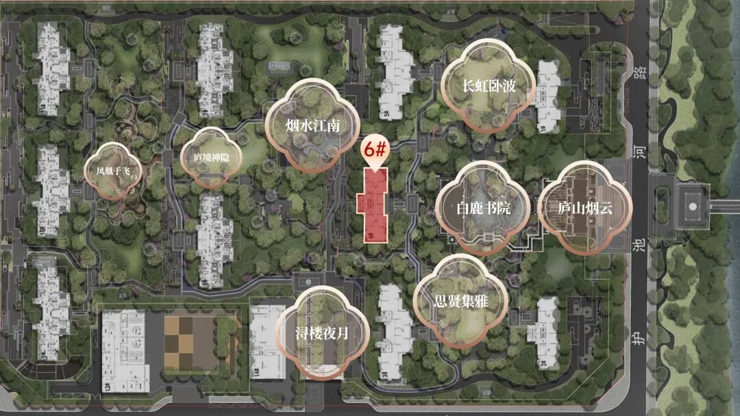 6#楼位处中轴,布局精巧,前有一轴三进院江南园林为屏,后有浔楼夜月、烟水江南等诗意胜境簇拥,真正做到了风光盈室,推窗即景。
