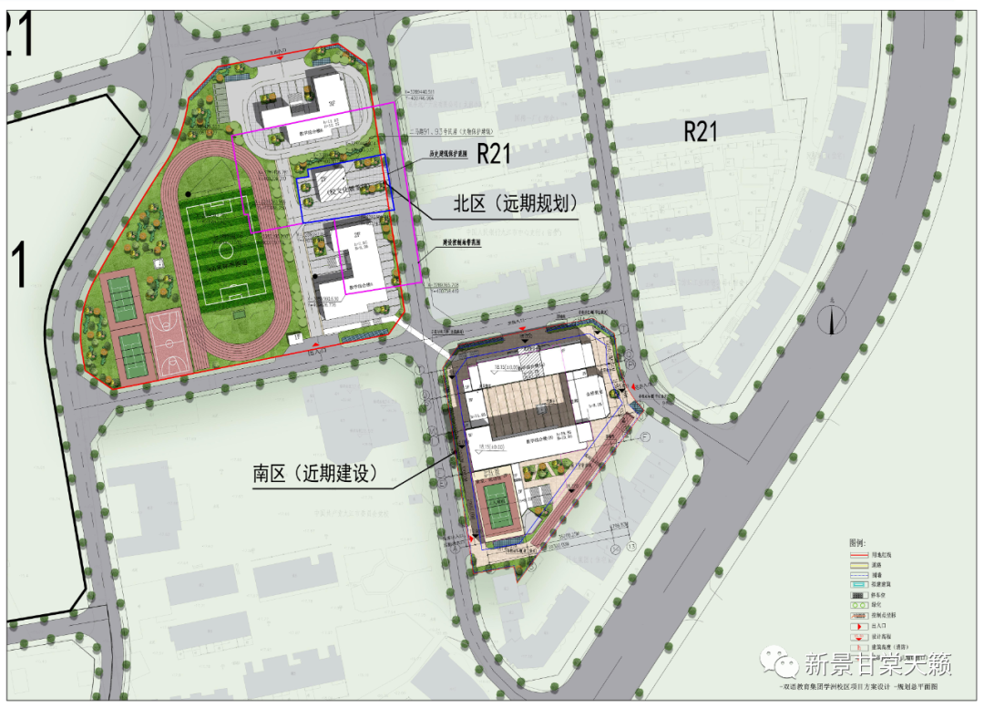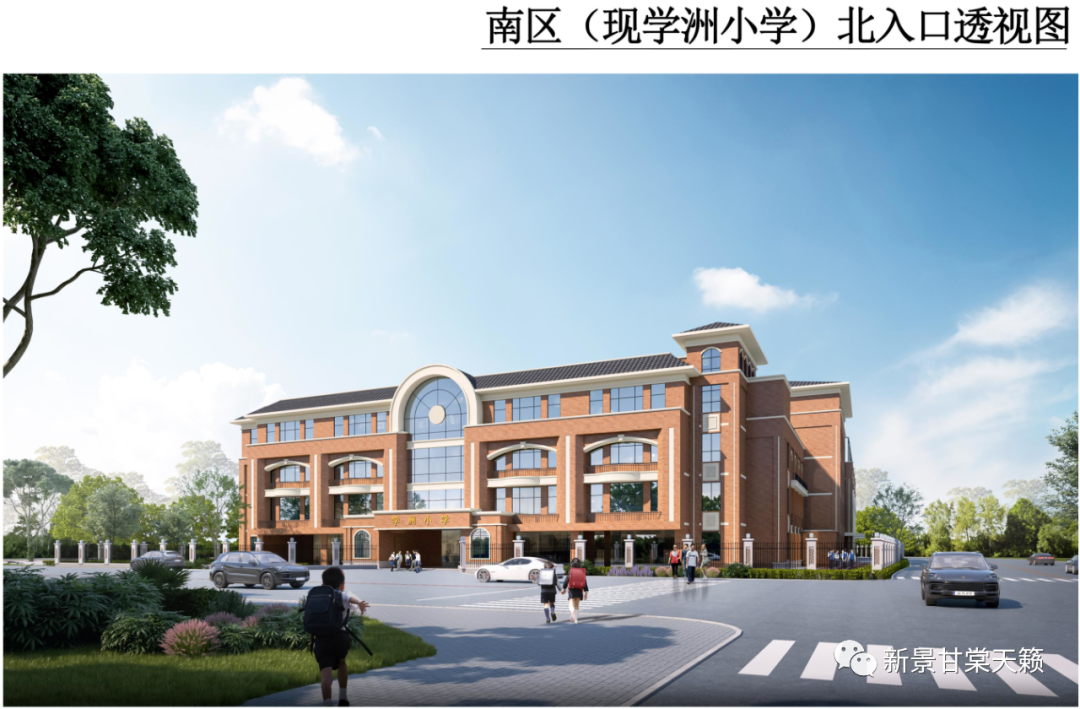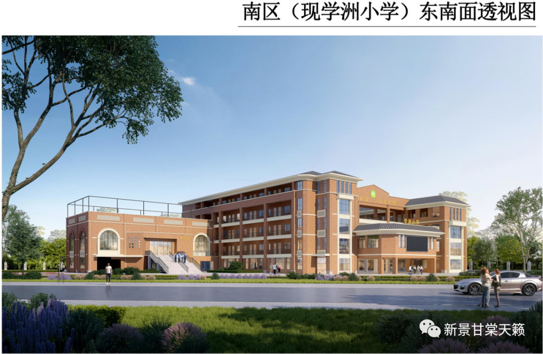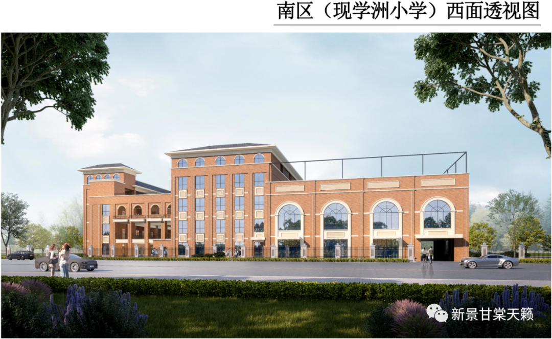 其中南区(现学洲小学)为期建设,用地面积5833.76平方米,总建筑面积10931.33平方米,容积率1.21,建筑密度39.04%,绿地率8.41%。北区(现滨兴小学)为远期规划,用地面积13197.80平方米,总建筑面积2791.82平方米,容积率0.21,建筑密度10.63%,绿地率40.09%。