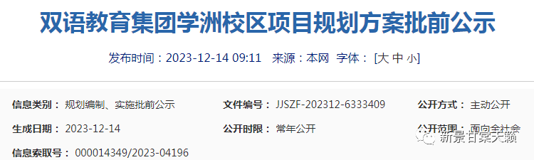 12月14日,九江市自然资源局发布了《双语教育集团学洲校区项目规划方案批前公示》的公告。