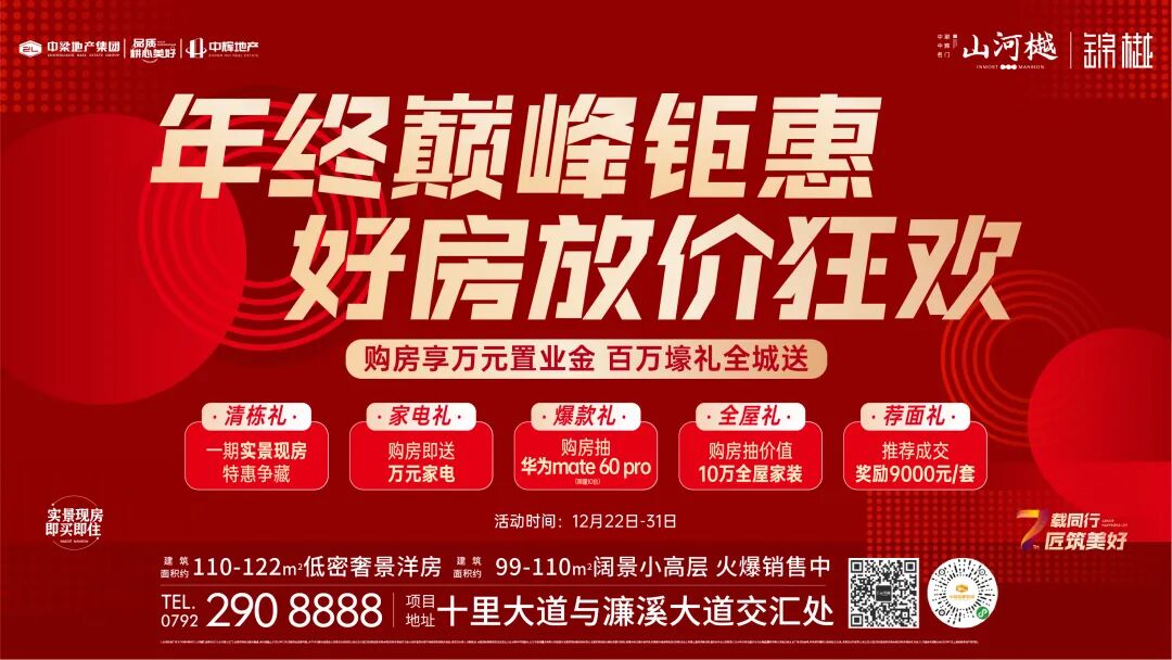 浔南城市客厅充分契合九江中心城区“南融”的战略逻辑,反而比熟透的地段更具成长性。山河樾雄踞城市南北大动脉十里大道中轴线,紧邻十里老城、濂溪大学城,全龄教育、三甲医疗一应俱全,妥妥的潜力无限、未来可期!住在山河樾有多方便?一脚油门就能冲到十里大楼、新天地、万达广场三大商业主场,下一顿丰盛的馆子,逛一逛热闹的夜市,看一场精彩的电影。项目还自带约2600㎡商业,未来将打造成一条精致的邻里休闲街区。出则繁华,入则宁静,住在洋房里也能享有高级烟火气。无论处于怎样的年龄段,居住改善的一大考量因素必须是健康养生的自然环境。山河樾占据的滨河景观与公园生活氛围,让项目宜居价值又拔高了一个维度。与项目一路之隔的是城区的生态绿肺——国家4A级景区南山公园,家门口就能悠游千亩绿色氧吧,周边还有7大公园环绕,散步、遛娃也有了好去处。山河樾毗邻的玉带河滨河景观堪比私家花园,茶余饭后在河边散步、观景,惬意无比。更惊喜的是,往南驱车半小时还可以游览庐山的诸多美景,周末度假说走就走。最后出场的超级彩蛋,来自年终KPI释放的*钜惠,五重壕礼百万让利,让人直呼心动!实景现房清栋一口价,购房送万元家电、抽华为mate60pro以及价值10万元的全屋家装,推荐成交奖励9000元/套。尤其值得一提的是,现在购房还可以享受万元返乡置业金,一波“特批”房源可以说是一惠到底!低至6字头的劲爆单价,产品力舒适度超高,实景品质呈现,无缝衔接中芯城区,公园环境,配套齐全……无论是横向比较当下的市场价格,还是纵向比较项目的综合价值,都没有比这更炸裂的存在了。