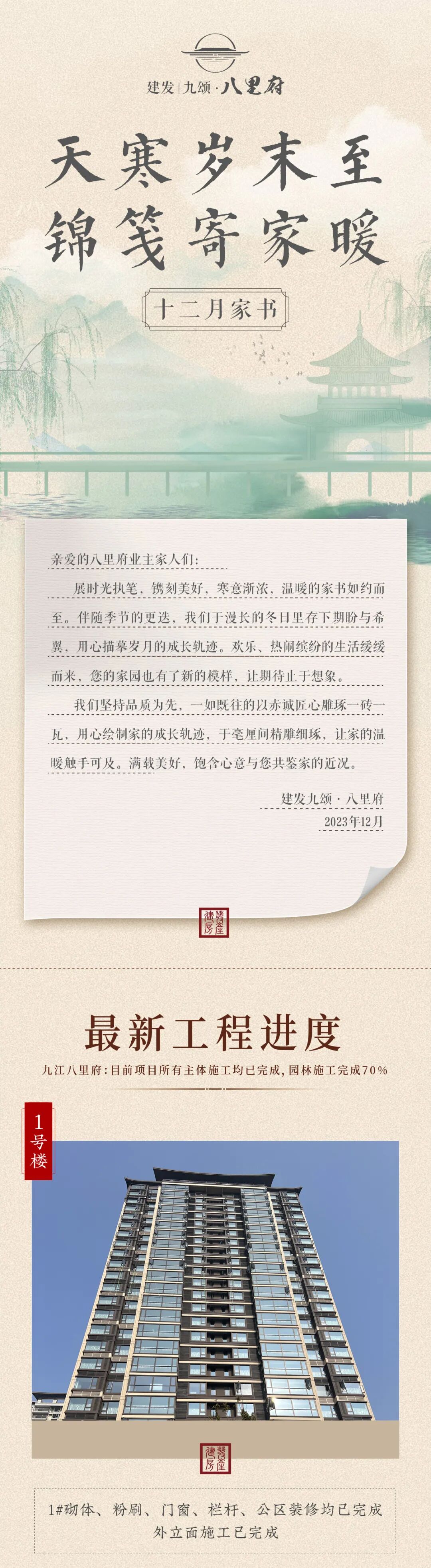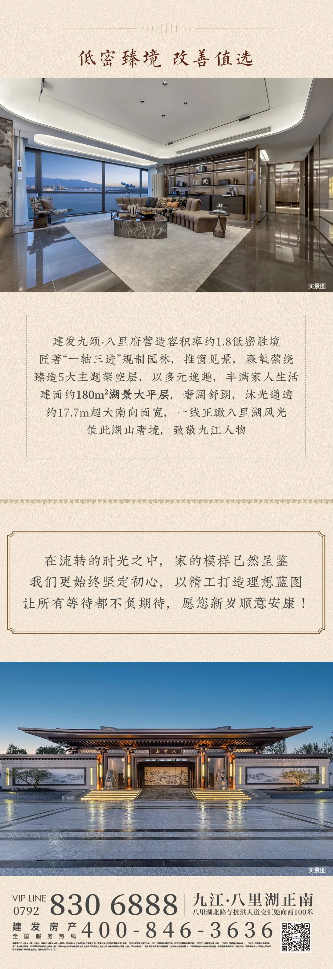 建发九颂·八里府为本案推广名,建发九颂·八里轩为本案备案名,开发商为九江兆益房地产有限公司。预售证号:(2021)房预售证第269号、(2021)房预售证第270号、(2021)房预售证第271号、(2022)房预售证第96号、(2023)房预售证第 14号。部分图片、文字等内容版权归原作者所有,本文只作为引用,如原作者表明身份要求本公司停止使用该素材,请及时与本公司联系删除。项目相关配套设施、场所运营及各功能区规划以交付使用状态为准,此资料仅供展示及参考。本资料户型图仅为户型结构示意,所涉及的建筑面积、装修平面效果、图示使用方式、图片文字数据或其他资料仅供参考,不作为交房标准及邀约承诺。相同户型单元,在不同楼栋、不同楼居、不同位置,面积、阳台结构、局部结构及外立面可能存在差异,实际交付以政府最后批准之法律文件及买卖双方签订的《商品房买卖合同》为准。因设计、施工、技术、政府政策、政府规划、政府规定的调整需要以及开发商未能控制的原因,项目存在调整产品种类、形式的可能,本公司保留对户型修改或优化的权利,敬请留意最新资料。置业计划内所列示各项信息仅供参考,不作为开发商价格及收费承诺,实际价格、税费等标准以合同签订及有关政府管理部门最新规定执行。贷款等相关信息仅作示意之用,具体标准以金融机构最终授信要求及审批结果为准。受制作批次、市场变化等限制条件或开发商不可控制的原因,开发商在保证以上建设质量的情况下可能进行更换品牌,如有变动,恕不另行通知。本宣传不对学区及入学条件做任何承诺,学校划分及入学条件以政府相关部门最终批准方案为准。本条微信内容为售楼宣传资料,相关内容不排除因政府相关规划、规定及开发商未能控制的原因而发生变化,文中所用图片、文字、视频、数据、位置示意、周边环境、交通、教育、商业及其他配套设施的介绍等仅作为参考之用,并非最终方案,不作为邀约或承诺。九江兆益房地产有限公司享有本活动最终解释权。建发房产全国服务热线 400-846-3636。本资料所发布的内容为2024年1月2日前的信息,敬请留意最新资料。