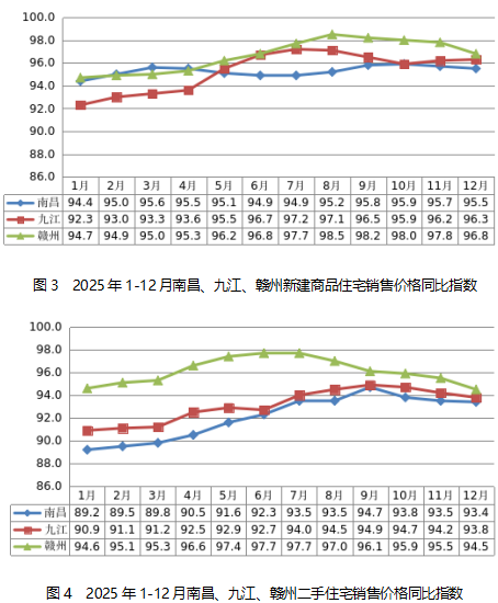 从同比看,2025年12月份三个重点监测城市新建商品住宅、二手住宅价格同比降幅扩大为主。南昌、九江和赣州新建商品住宅价格同比分别下降4.5%、3.7%和3.2%,其中,南昌、赣州同比降幅较上月分别扩大0.2、1.0个百分点,九江同比降幅较上月收窄0.1个百分点。南昌、九江、赣州二手住宅价格同比分别下降6.6%、6.2%和5.5%,同比降幅较上月分别扩大0.1个、0.4个和1.0个百分点。