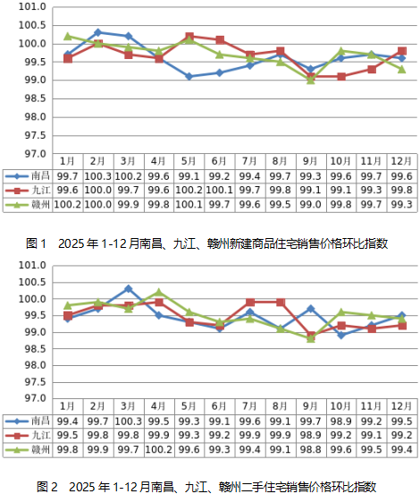 从环比看,2025年12月份三个重点监测城市新建商品住宅价格和二手住宅价格均下降。南昌、九江和赣州新建商品住宅销售价格环比分别下降0.4%、0.2%和0.7%;二手住宅价格环比分别下降0.5%、0.8%和0.6%。