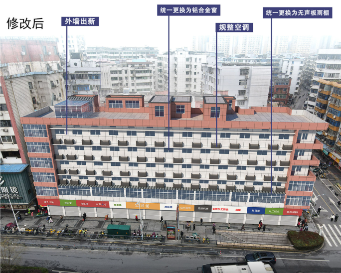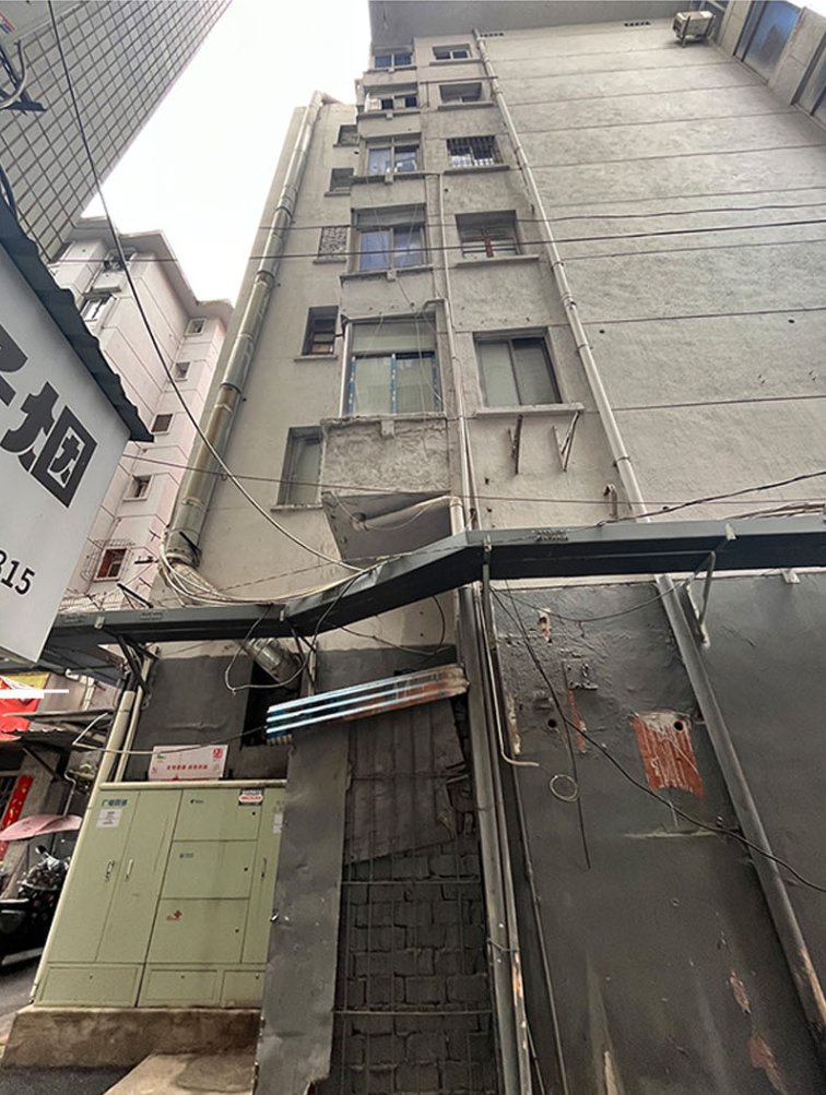 本项目建于80年代,底框砖混结构。立面外墙余料存在褪色、剥落等问题;门窗多为老旧钢窗或木窗保温隔音性差,外凸防盗网及杂乱的雨棚和店招,影响沿街立面整洁性。