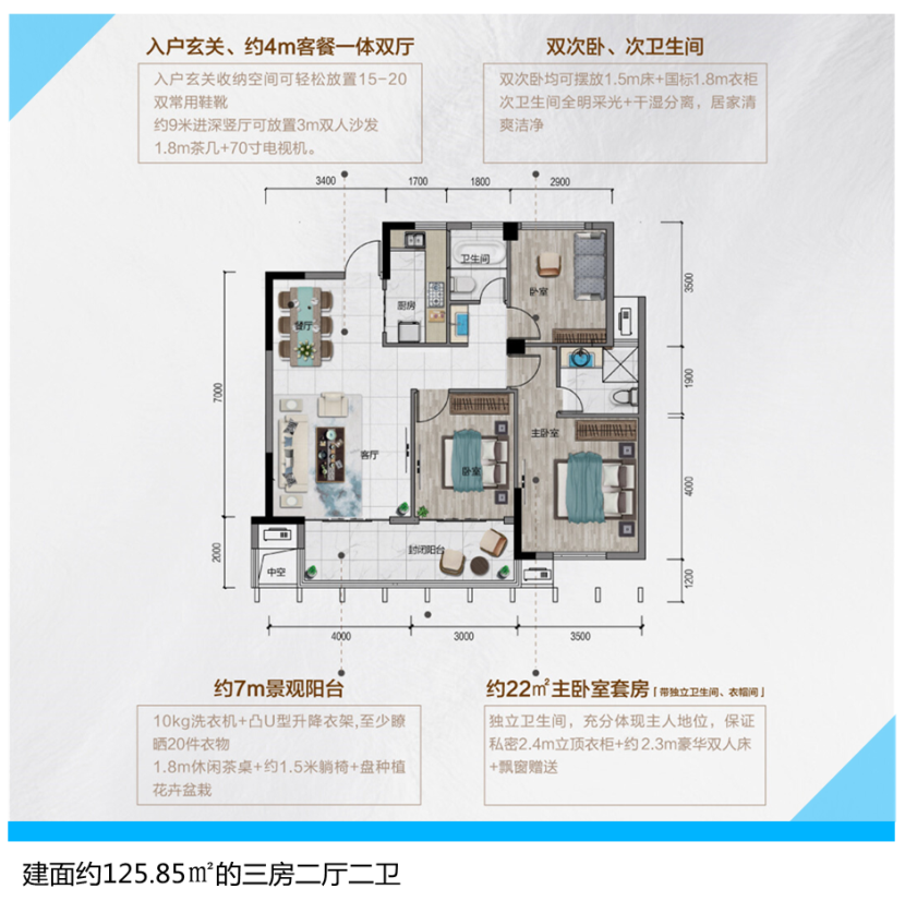项目G1户型,建面约125.85㎡的三房二厅二卫,约4米的方正客厅,约7米阔景阳台,约3.5米的主卧,2个卫生间,让尺度与功能都能一步到位。整套房子几乎没有浪费的过道空间,进门处是L型厨房,南面双联阳台的设计,空间利用率相当之高!