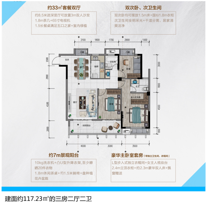 除此之外,这款户型很好的做到了动静分区,一边是居住功能区,而另外一边是公共活动区,利用动静分区的动线,减少移动的空间,将空间利用率提高。如果预算不足的话,可考虑这款G2户型,建面约117.23㎡的三房二厅二卫,相比于G1户型,G2户型为中间户,面积要小点,相对的,总价也不会那么高,还能满足日常所需。