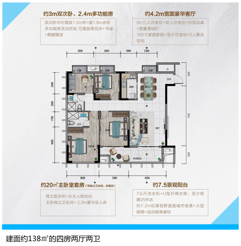 项目G3户型,建面约138㎡的四房两厅两卫,是市场里面少见的户型尺度,能真正满足三胎时代下中产阶层一步到位的置业共识。约4.2米阔绰大开间客厅,7.5米超宽大阳台。约20㎡的超大主卧套房,独立卫浴,近3.6米的大面宽,其中2个卧室还有超大飘窗赠送。3米L型全明厨房。直接将空间尺度感拉满。此外,对于投资和预算不足的人来说,项目拥有建面约31-58㎡多功能型LOFT公寓,4.8米挑高。其中建面约58㎡户型采用灵动三钥匙户型设计,上下两层独立厨卫,楼上楼下空间独立。同时民用水电和通天然气,即为生活节约了成本,又给生活带来了便利。
