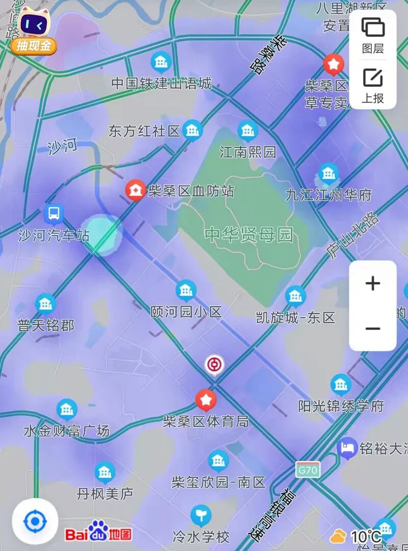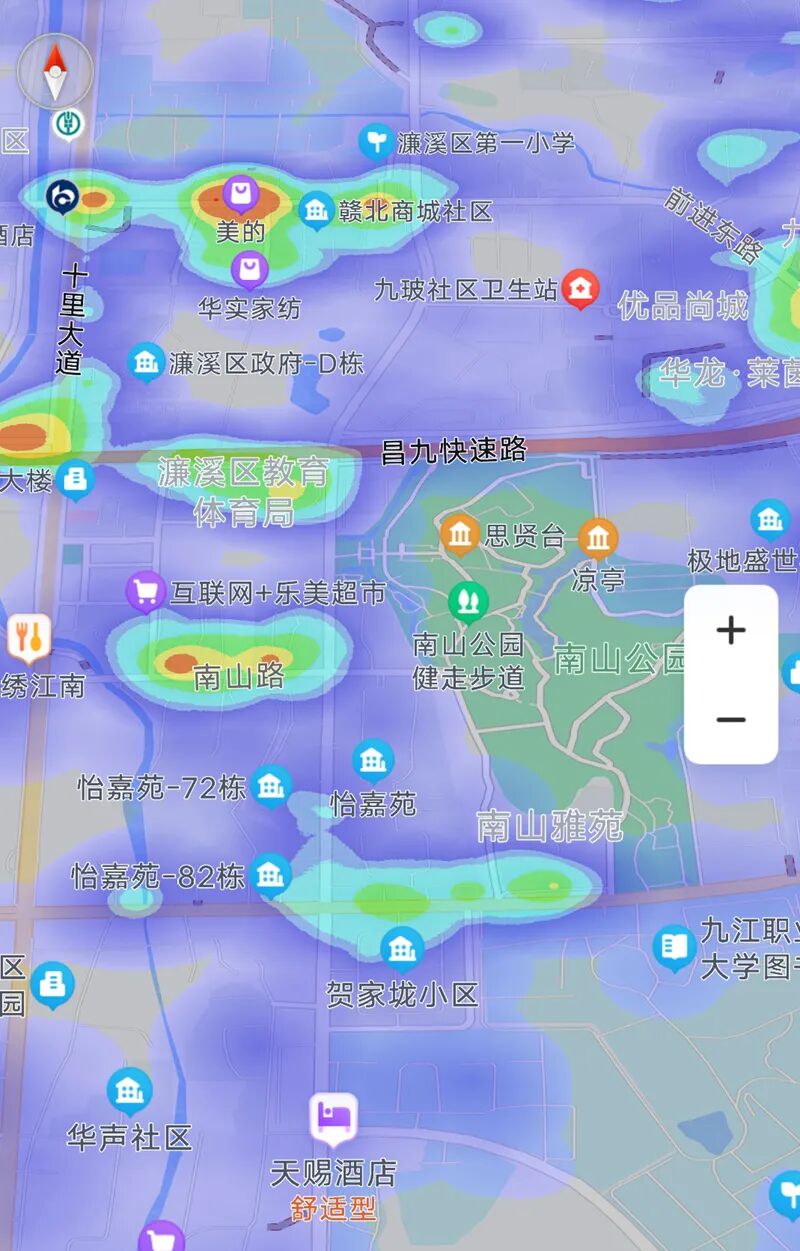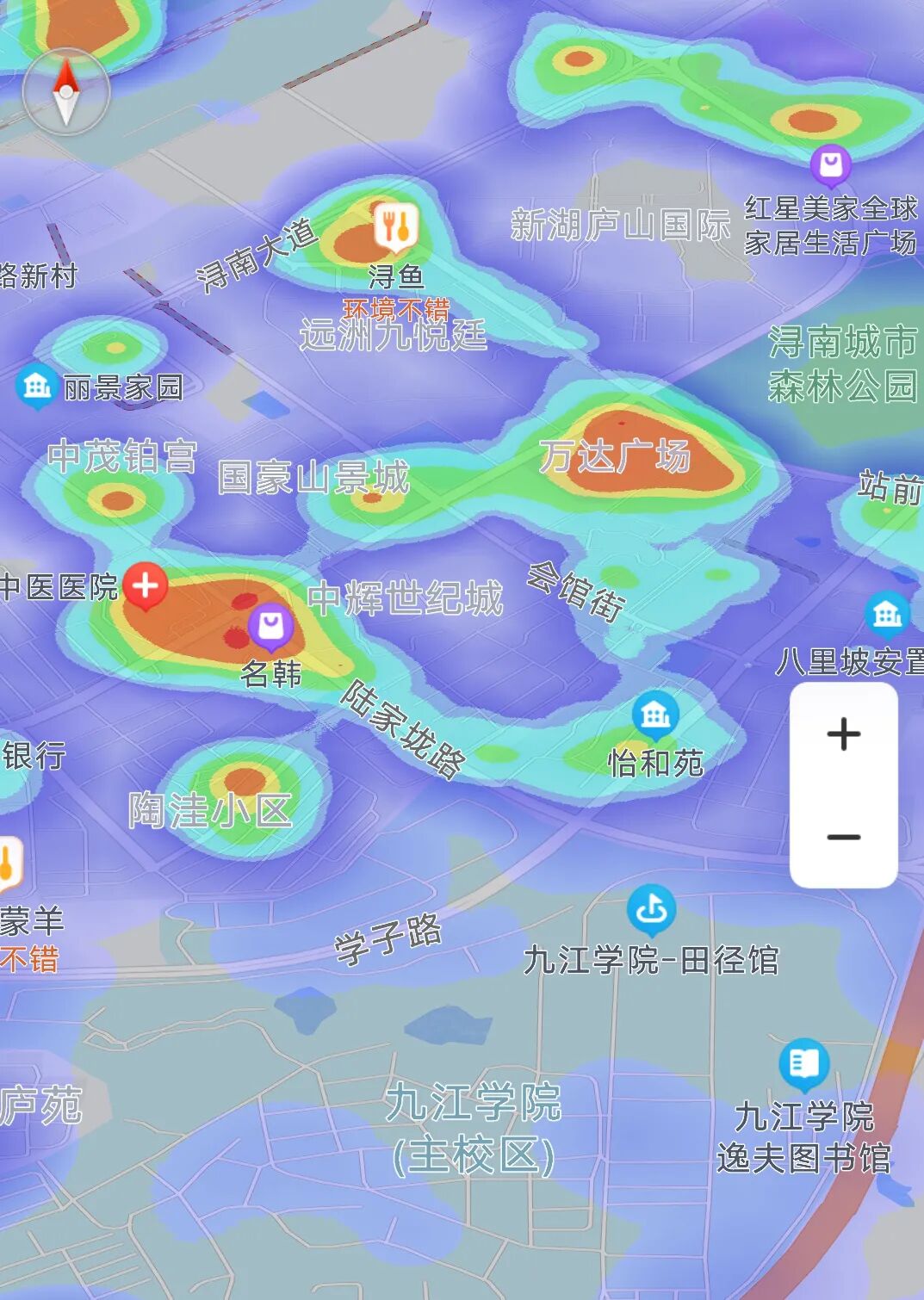 从热力图上我们可以看到,浔阳区的大中路、和中广场、新马狮购物中心、湖滨小区以及火车站等附近,人口流量大,热力值也高。