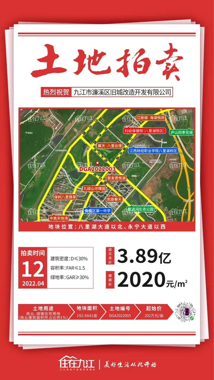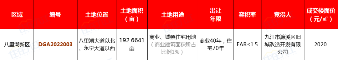 刚刚,位于八里湖大道以北、永宁大道以西的DGA2022003地块成功出让。被九江市濂溪区旧城改造开发有限公司以总价3.89亿竞得,成交楼面价2020元/㎡,溢价率0%。
