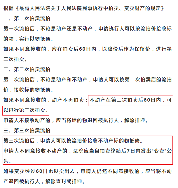 此外,如果三拍依旧流拍的话,还可以变卖。一般来说,变卖的价格在第三次起拍价的八成之内,但不得低于评估价的五成。