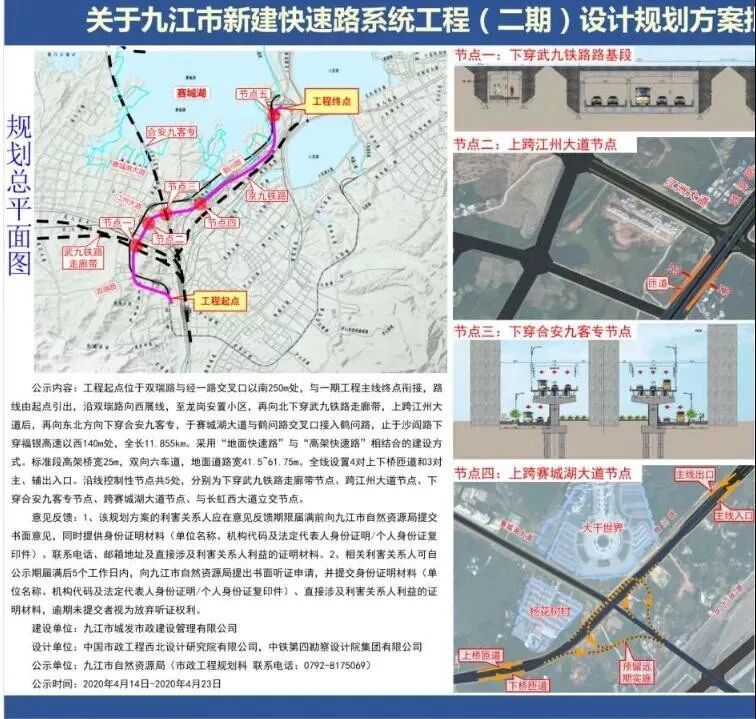 九江新建快速路工程线路全长15.1km,是九江中心城区第一条高架桥快速路,也是九江市历史上投资最大的单体市政工程。其中二期工程工程全长11. 855km沿线控制性节点共5处,分别为下穿武九铁路走廊带节点、跨江州大道节点,下穿合安九客专节点、跨赛城湖大道节点、与长虹西大道立交节点。