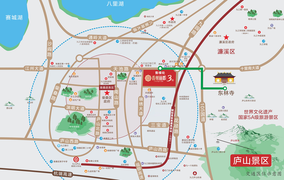 九江香榭丽都项目位于柴桑高铁新区、八里湖新区及濂溪区的交汇点,地理位置优越,距昌九高速收费沙河站百度距离约3公里,项目东侧快速高架在建中,105国道,九园路及通岭大道等多条道路可以互通九江市,坐享九江三大区域发展红利。