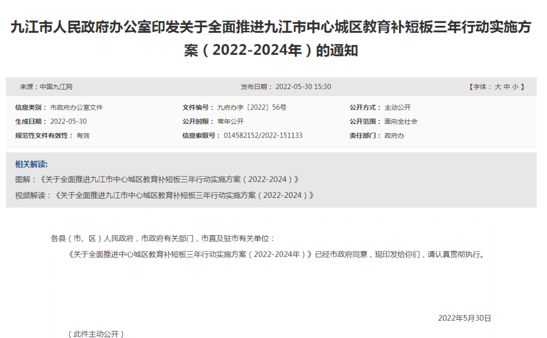 近日,九江市人民政府办公室印发了《关于全面推进九江市中心城区教育补短板三年行动实施方案(2022-2024年)》的通知,从学前教育到高等教育均有涉猎。