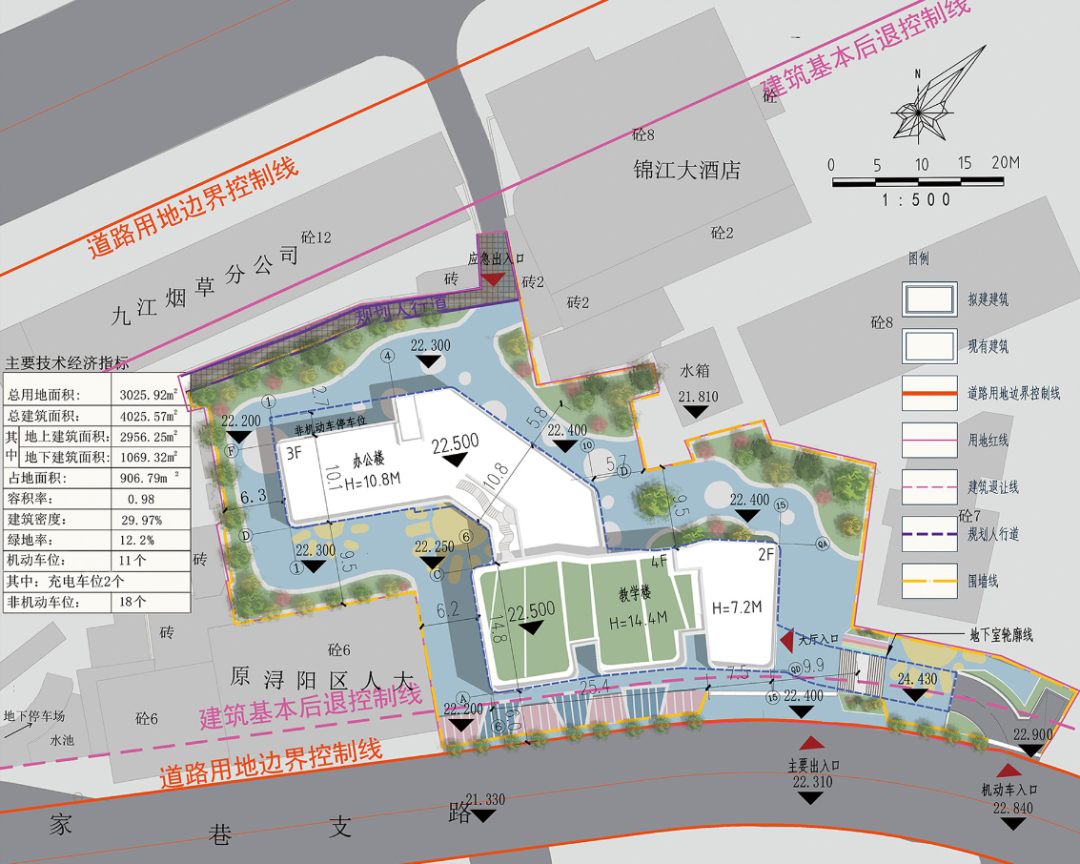 规划条件:用地性质为幼儿园用地,容积率<1.0,建筑密度<30%,绿地率>10%。本设计方案总建筑面积4025.57㎡,其中地上建筑面积2956.25㎡,地下建筑面积1069.32㎡,占地面积906.79㎡,容积密0.98建筑密度29.97%,绿地率12.2%,机动车位11个,非机动车位18个。