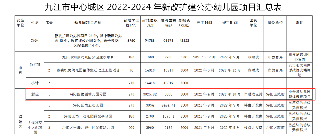 前几天,九江市公布了中心城区2022-2024年新改扩建公办幼儿园项目表,通过表上可以得知浔阳区第四幼儿园分园就是现在的小金星幼儿园的整体搬迁项目。