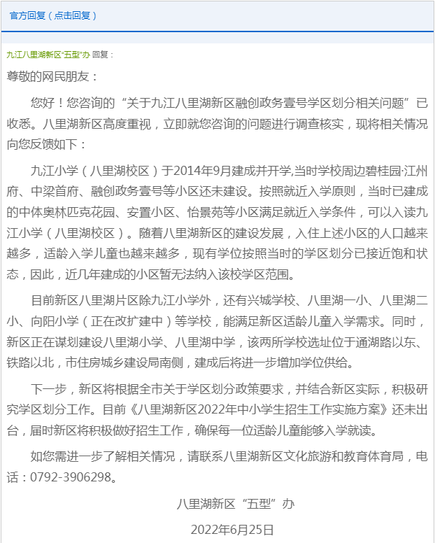 您好!您咨询的“关于九江八里湖新区融创政务壹号学区划分相关问题”已收悉,八里湖新区高度重视,立即就您咨询的问题进行调查核实,现将相关情况向您反馈如下: