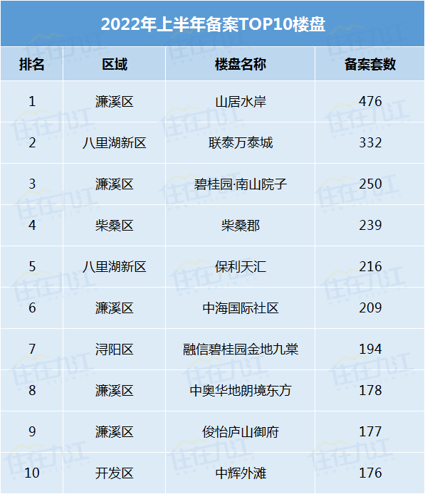 2022年上半年,TOP10楼盘总备案2447套,占上半年总销量的40%,其中,濂溪区有5盘上榜。山居水岸总备案量476套,居于榜首;联泰万泰城332套,居于第二;碧桂园南山院子250套居于第三。