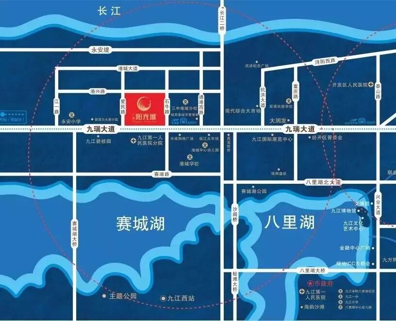广隆·阳光城位于开发区九瑞大道与石牛路交汇处,位于“大两湖”时代的轴心位置。从项目到八里湖新区、柴桑区、老城区交通便利,而且小区门口就19路、56路公交经过,出行随意,交通便捷。 项目东侧三公里处设有临江大市场(菜市场)、乐买购生活超市、江州农商银行、农业银行、九江银行、九江水果大市场也将搬迁到西北侧2000米的位置,商业配套成熟齐全;爱国卫生医院、九江市第一人民医院城西分院,为您和家人健康保驾护航。