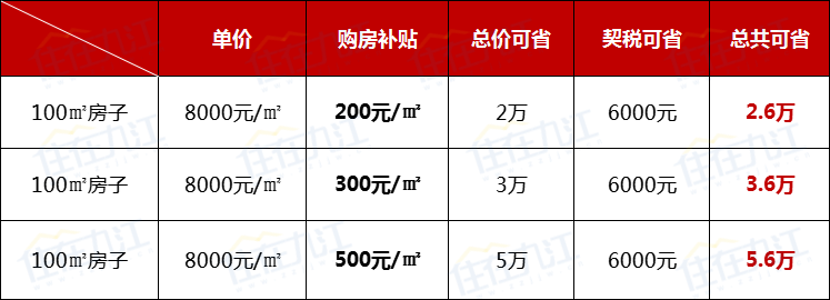 根据政策可以知道,现在购买中心城区新建商品房,按最低200元/㎡的补贴计算的话,购房一套100㎡的房子可以省下2万元!按最高500元/㎡的补贴来计算的话,购房一套100㎡的房子则可以省下5万元!