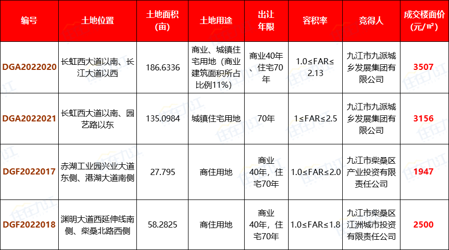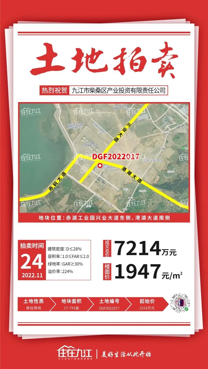 DGF2022017地块被九江市柴桑区产业投资有限责任公司以总价7214万元竞得,成交楼面价1947元/㎡,溢价率224%。