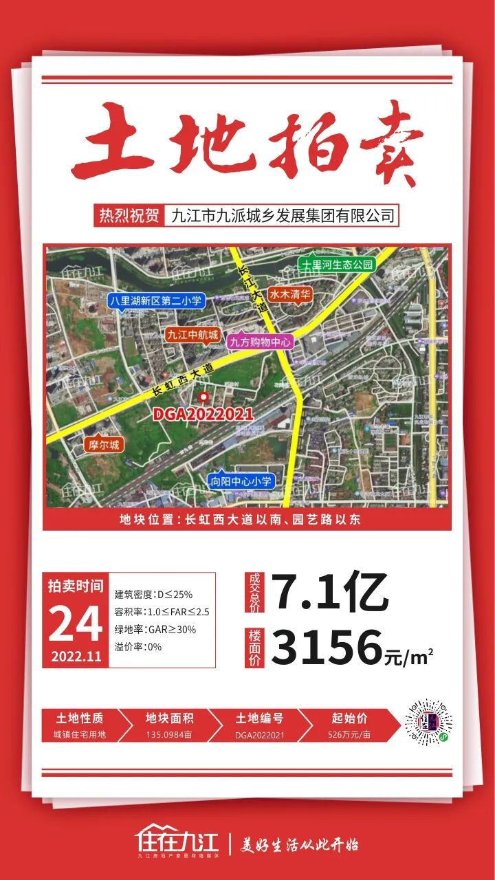 DGA2022021地块被九江市九派城乡发展集团有限公司以总价约7.1亿元竞得,成交楼面价3156元/㎡,溢价率0%。
