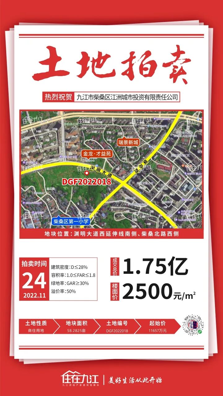 DGF2022018地块被九江市柴桑区江洲城市投资有限责任公司以总价1.75亿元竞得,成交楼面价2500元/㎡,溢价率50%。