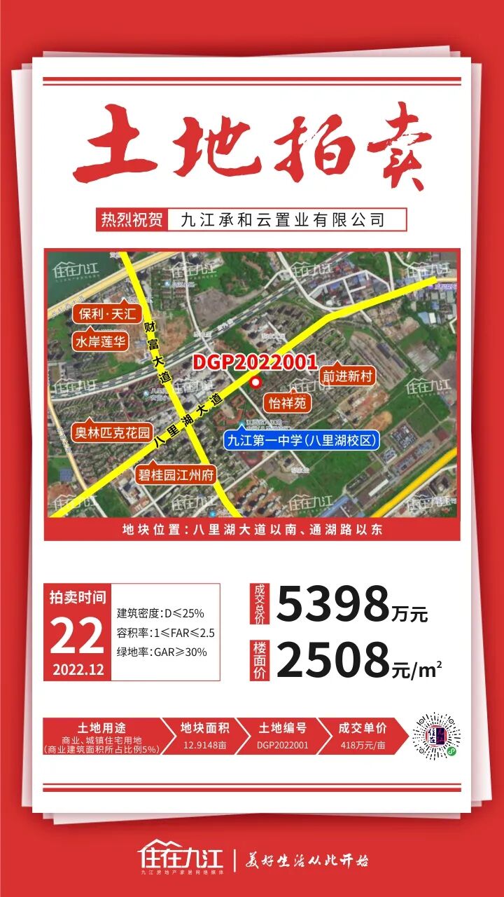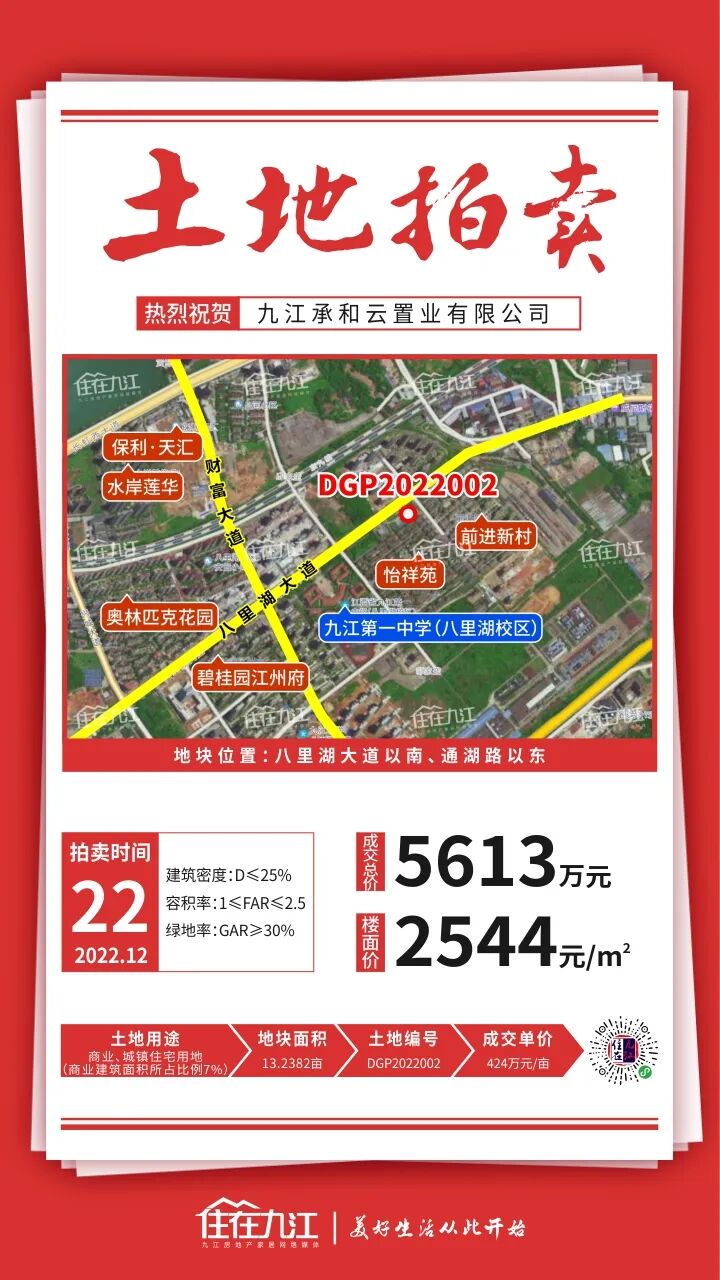 12月22日,八里湖新区2宗商住用地底价成交,竞得人均是九江承和云置业有限公司,宗地总面积约26亩。